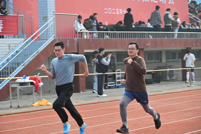 外院师生在短跑赛道上,他们似离弦之箭,枪声响起的瞬间全力冲刺,耳畔的风与观众的呐喊交织,每一步都向着终点奋力迈进;在中长跑赛段里,耐力与意志的较量悄然展开,他们咬紧牙关坚持到底,用不服输的韧劲突破体能极限;跳远沙坑前,助跑、起跳、落地,一系列动作连贯流畅,沙粒扬起的轨迹里,藏着他们反复练习的专注;在接力赛中,队员们眼神坚定、配合默契,接力棒在掌心传递的不仅是速度,更是团队的信任与并肩作战的力量。