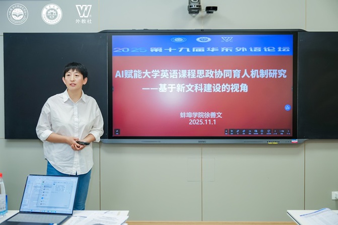 11月1日,在厦门集美大学召开的第十九届华东外语论坛上,外国语学院徐善文老师应邀以《AI赋能大学英语课程思政协同育人机制研究---基于新文科建设的视角》为题作分论坛发言,分享了她在学校“地方性、应用型、数智化”办学定位引领下,开展大学英语课程思政智慧教学的创新模式与实践成效,引发了与会代表的积极关注。
