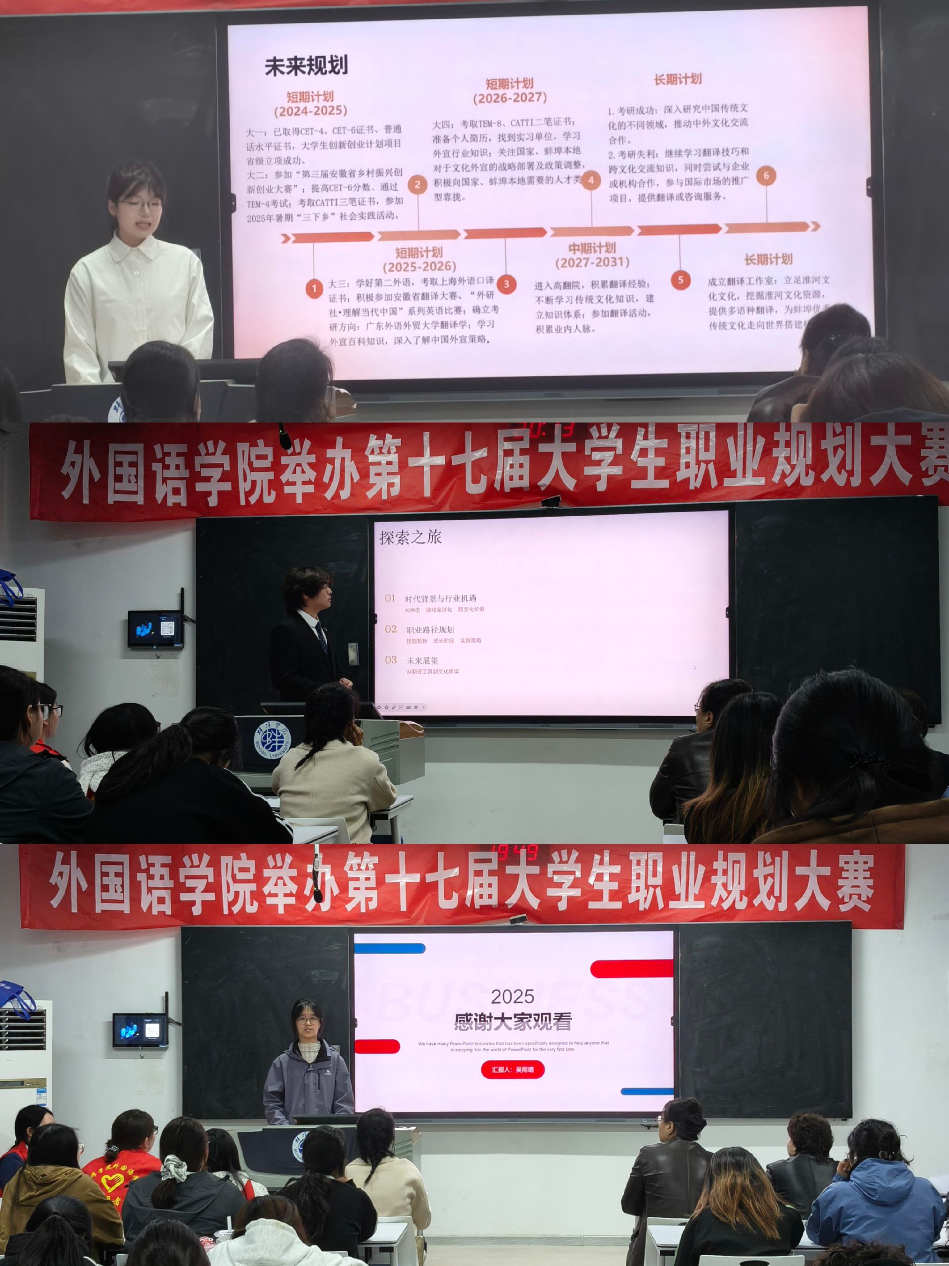 青春因规划而精彩,未来因奋斗而可期。外国语学院始终高度重视学生职业发展指导,此次职业生涯规划大赛的成功举办,既是对学院就业指导工作的一次有力实践,更是为青年学子点亮职业明灯、助力梦想启航的重要举措。愿外院学子以此次大赛为契机,明确目标、笃行不怠,在未来的职业征程中乘风破浪,书写属于自己的精彩人生。(撰稿:王俊,吴金玥;编辑:王刚;审核:夏春晓)