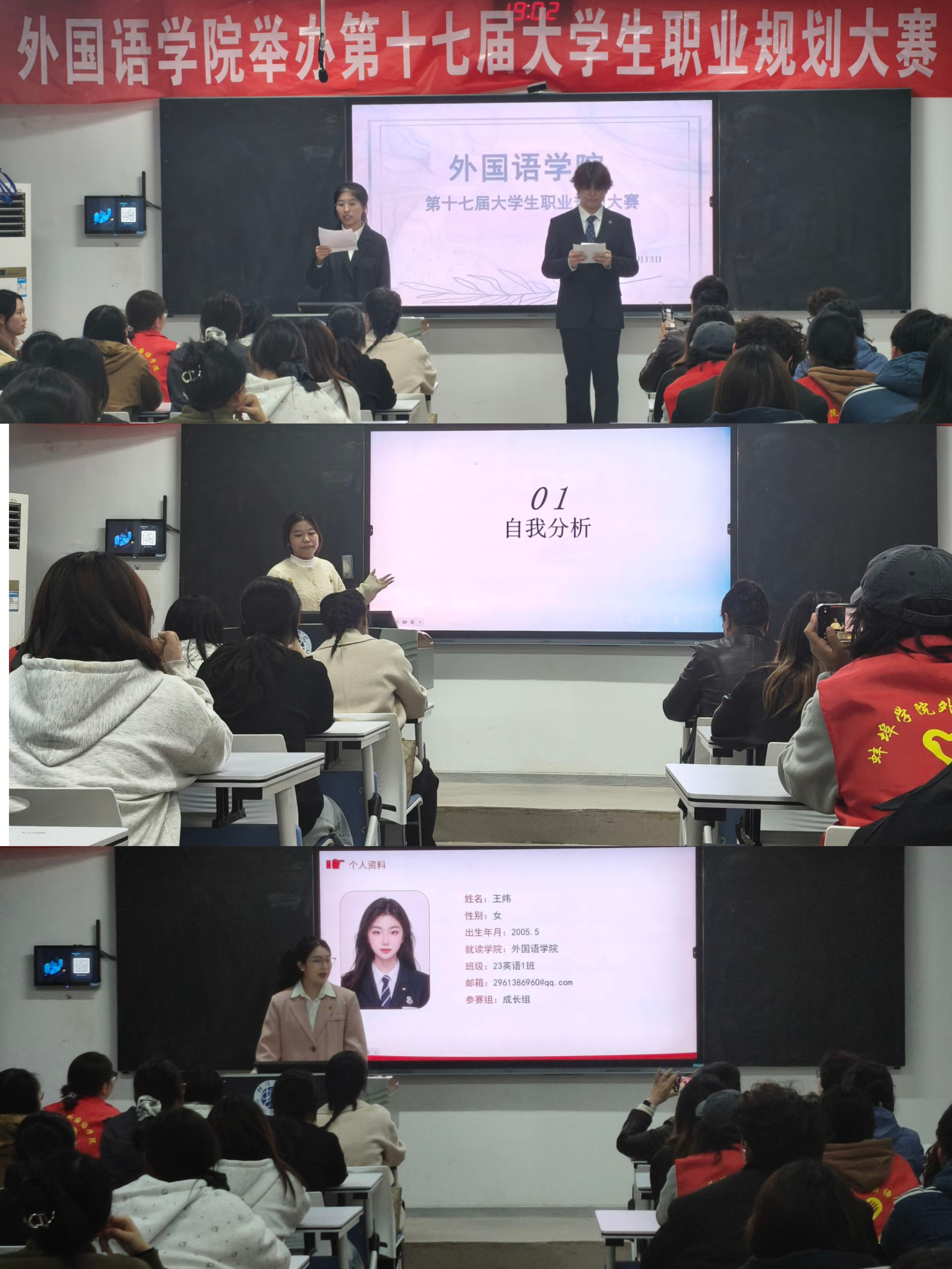 为帮助学子明晰职业方向,树立科学职业观与就业观,锤炼职业规划核心能力,夯实未来职业发展根基,11月13日晚,外国语学院第十七届大学生职业规划大赛在教学楼C103顺利举办。学院党委书记夏春晓、学院党委副书记周颖、学院党委副院长卢洁,学院团委负责人王娜娜及辅导员吴金玥、薛柳柳和刘云宵受邀担任评委,与现场学子共同见证这场青春与梦想的碰撞。