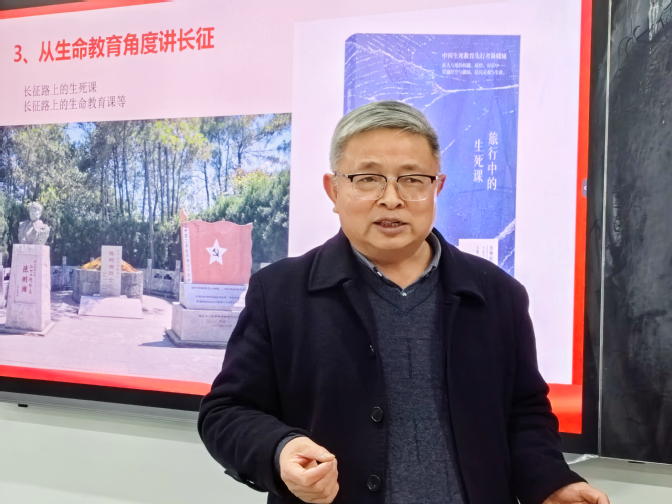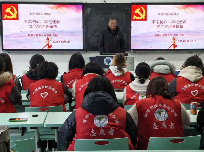 为厚植青年志愿者红色基因、筑牢信仰之基,12月3日下午,蚌埠市大慈义工协会“薪火宣讲团”走进外国语学院,在教学楼教室B128开展“传承红色基因,赋能志愿同行”主题宣讲。外国语学院50余名青年志愿者参与本次培训,共同上了一堂“行走的思政课”。