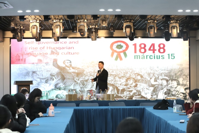 活动现场,匈牙利约翰·冯·诺伊曼大学卡帕缇·约瑟夫博士(Dr.Kárpáti József)应邀为全场师生带来专题讲座。卡尔帕蒂博士围绕匈牙利历史发展、文化特色、民俗风情与人文精神进行细致讲解,以生动的语言、详实的资料带领大家深入了解多瑙河畔的文化国度,让在场师生对匈牙利文化有了全面而深刻的认识,讲座内容兼具知识性与趣味性,赢得现场阵阵掌声。