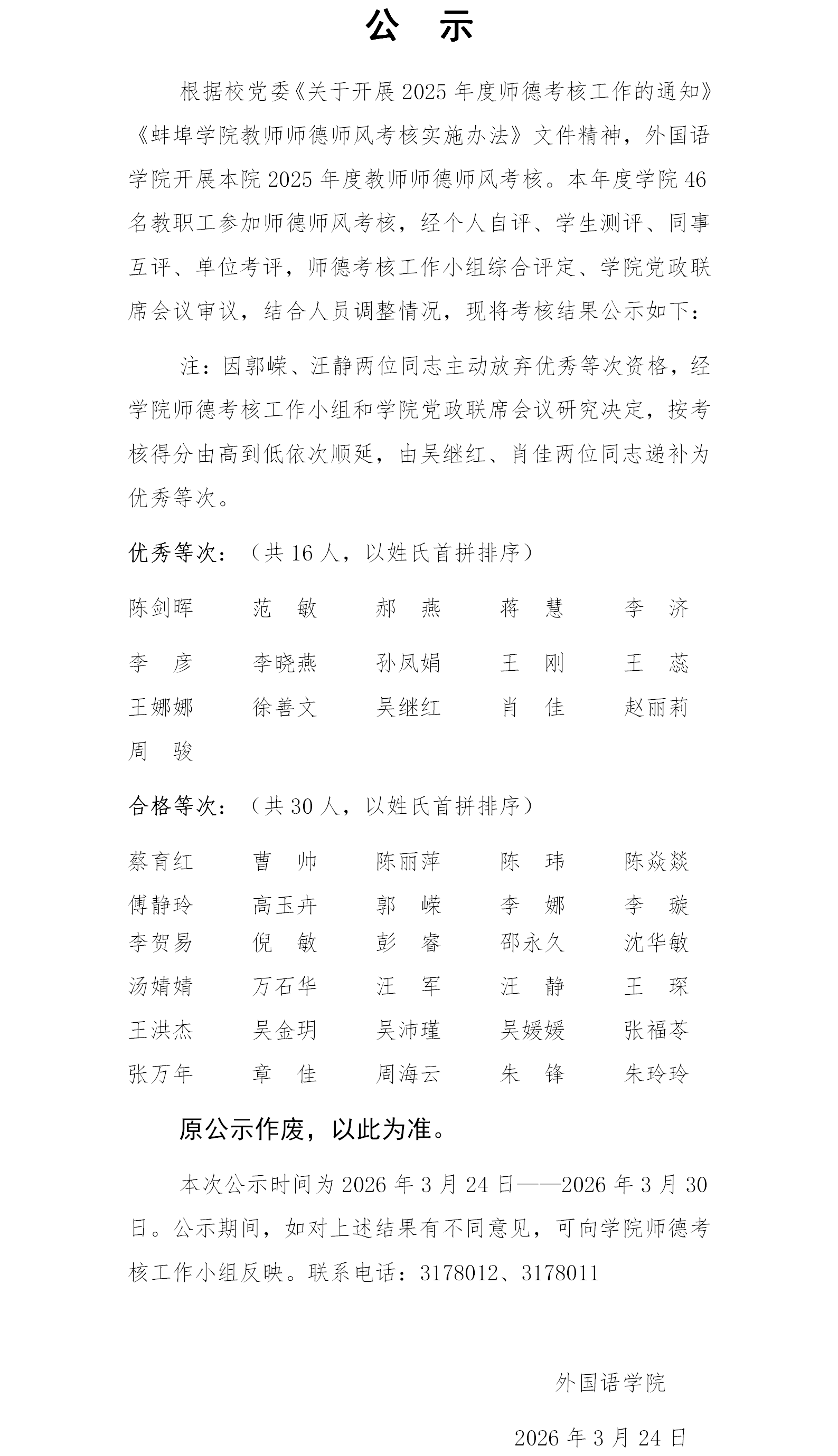 补充公示-关于2025年度外国语学院师德考核结果的补充公示