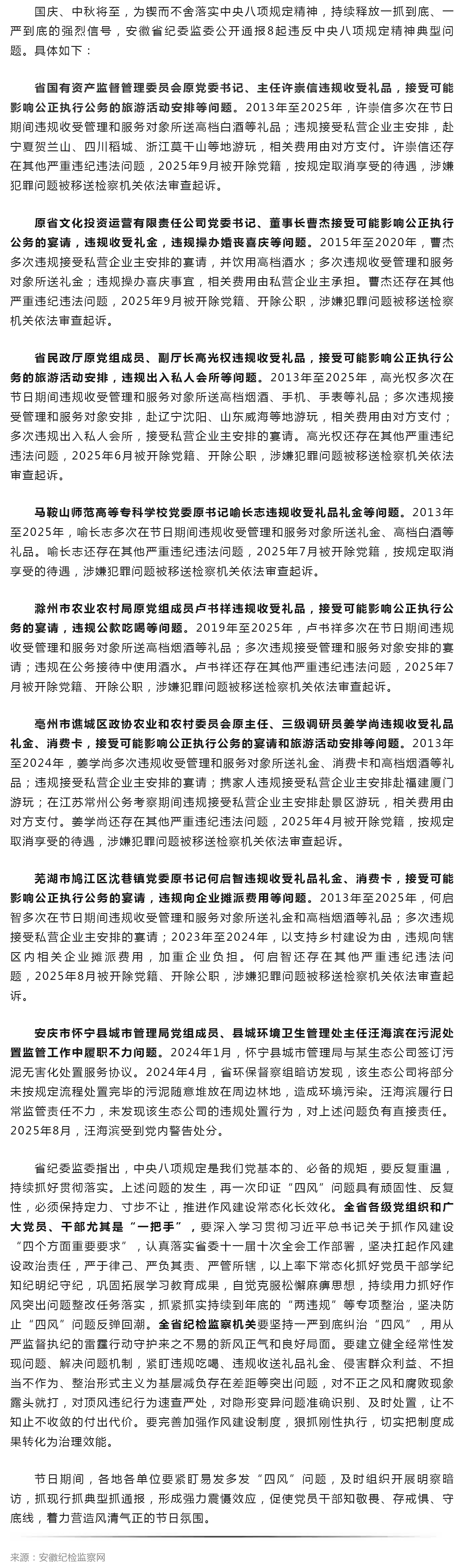 安徽省纪委监委公开通报八起违反中央八项规定精神典型问题